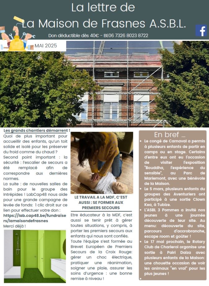 La lettre de la Maison de Frasnes – Les grands chantiers démarrent Publié le Mai 29, 2025 par karinbali www.lamaisondefrasnes.be Partager : Partager sur X(ouvre dans une nouvelle fenêtre) X Partager sur Facebook(ouvre dans une nouvelle fenêtre) Facebook J’aime chargement… Similaire